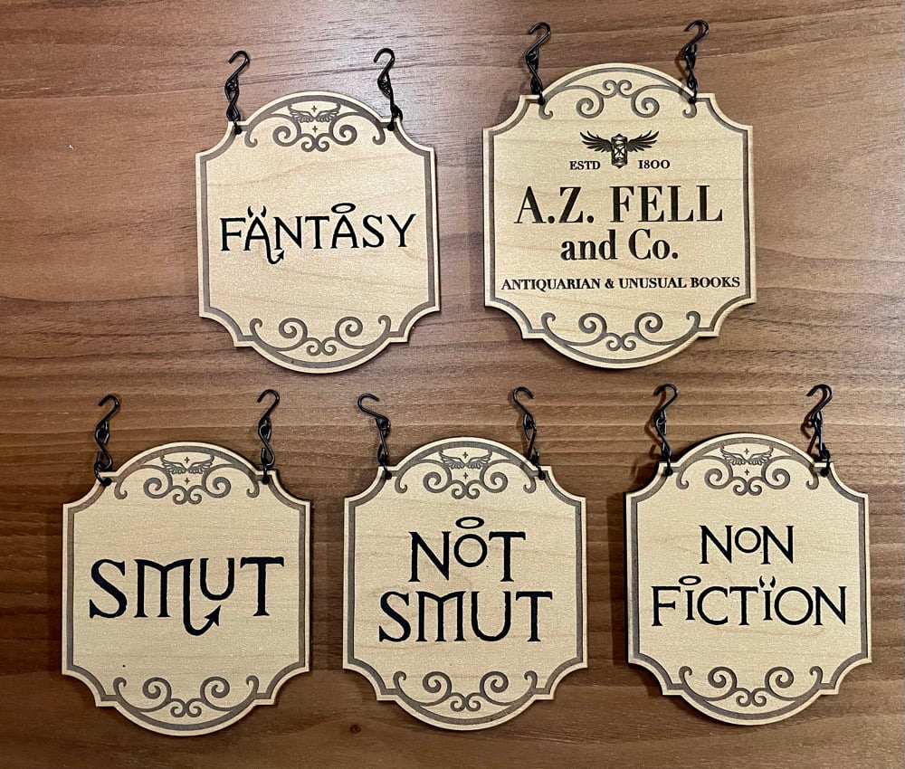 This listing is for a single Good Omens themed shelf divider. Select which engraved wood sign you want from the options!