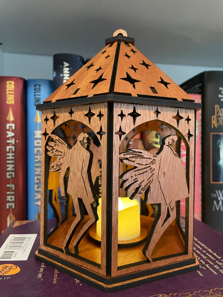 These six-sided lanterns are designed by me and made from engraved mahogany wood, with alternating Aziraphale and Crowley! It includes a small electronic flickering candle for a lovely warm effect. One panel of the lantern is open to allow for battery changes on the candle.