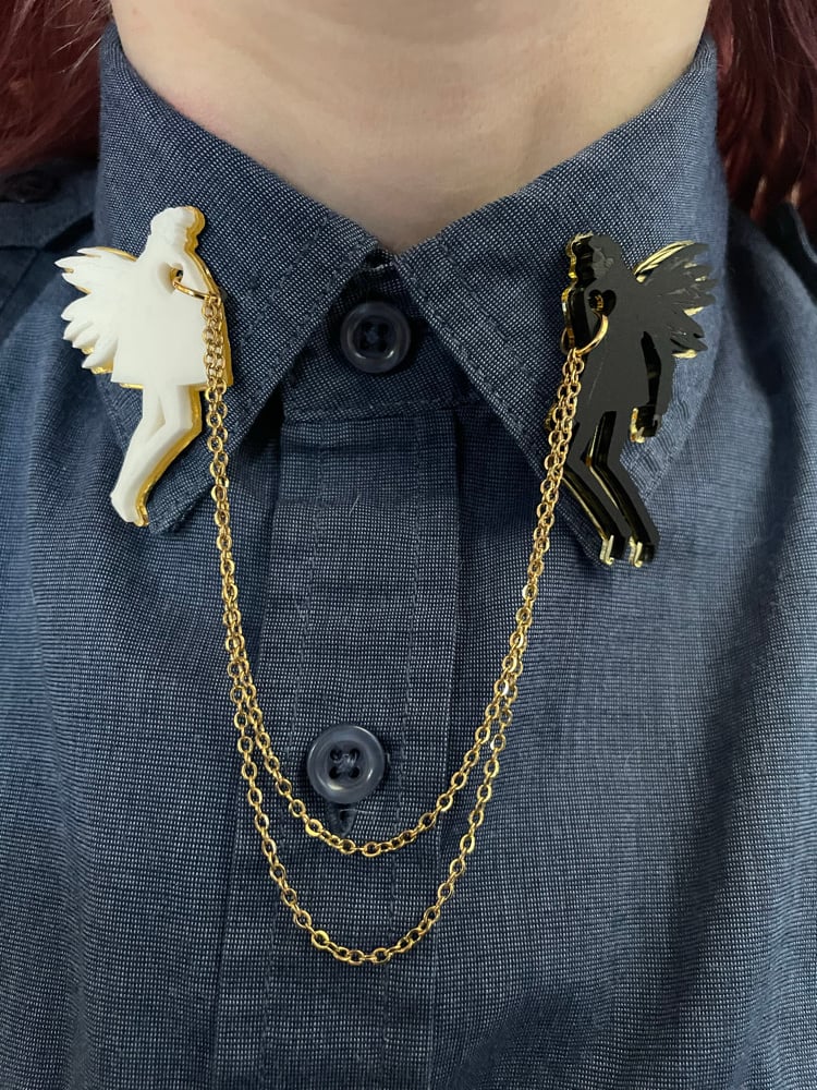 It’s been three years since I originally made these, so it’s time for upgraded versions! Carry your very own guardian angels with you wherever you go. Aziraphale and Crowley are made from engraved matte acrylic set against either gold or silver mirror acrylic and connected by gold or silver chains.