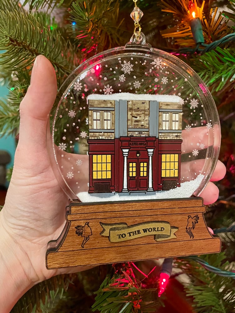 Each acrylic snowglobe is 5 inches high and 4.25 inches wide. The bookshop inside is laser-engraved and hand painted wood, with tiny glass micro-bead snow that can be shaken.